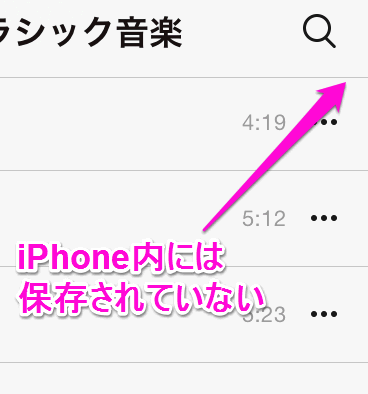 曲名が表示されているのに右側にアイコンがないものは、そのiPhoneやiPadには保存されていない曲になります。