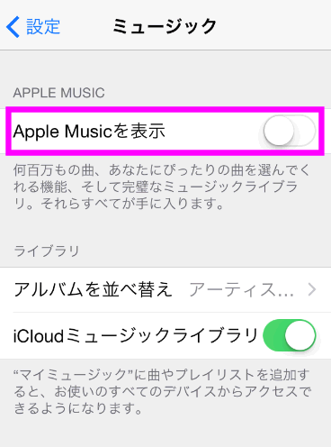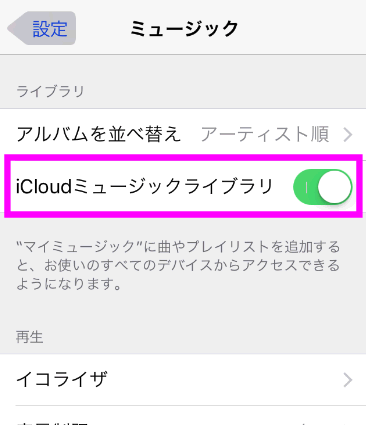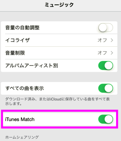 iCloudミュージックライブラリの曲を表示するには、ここをオン(黄緑色)にします。