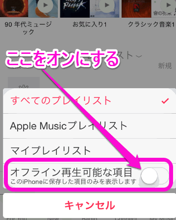 「オフライン再生可能な項目」がオフ(灰色)になっていると、そのiPhoneやiPadに保存されている曲しか表示されなくなります。
