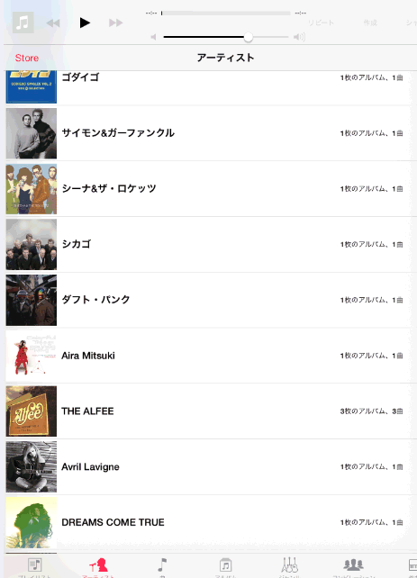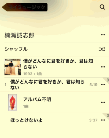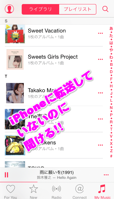 iCloudミュージックライブラリと同じで、そのiPadやiPhoneに曲が保存されていなくても、パソコンやメインのiPhoneに保存されている曲のリストが表示されました。
