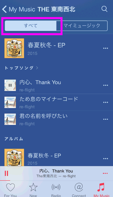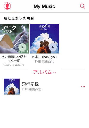 「My Music」を表示させ、「アルバム」(または「アーチスト」「曲」などの場合もあります)の部分をタップします。