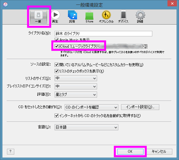 「iCloudミュージックライブラリ」にチェックを入れ、OKをクリックします。