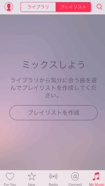「プレイリスト」をタップすると、「プレイリストを作成」というボタンがあるだけ・・・