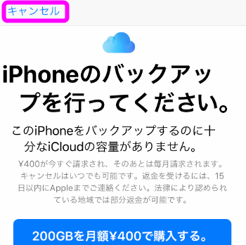 もし、このように「iPhoneのバックアップを行ってください」と表示されたら、左上の「キャンセル」をタップしてください。