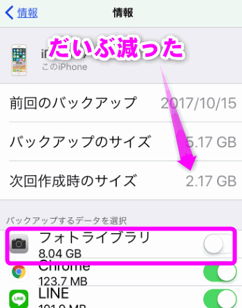 「写真」と「フォトライブラリ」を削除したことにより、「次回作成時のサイズ」がだいぶ減りました。