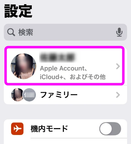 設定を開き、一番上の自分の名前(Apple アカウント)をタップします。