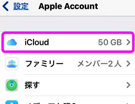 「Apple ID」という画面が表示されるので、「iCloud」の部分をタップします。