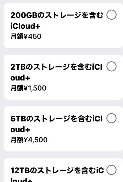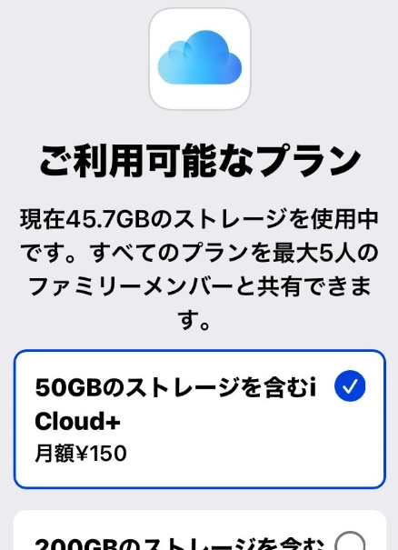 私は50GB(130円/月)を契約しています。が、写真をたくさん撮影する人は、200GB(400円/月)がおすすめ。
