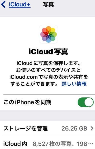 これはどういうことかというと、古いiPhoneで撮影したであろう写真がiCloudに残っている場合、iCloud経由で現在のiPhoneにコピーされたが、「同期をオフ」することによって、その写真は削除されますよ、ということ。