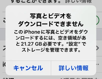 「写真とビデオをダウンロード」を選択した場合、iPhone内のストレージ容量が少ないと、このような「写真とビデオをダウンロードできません」という表示になって、ダウンロードが出来ません。