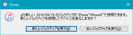 なお、このように新しいバージョンのiOSのバックアップを使うか聞いてきますが、復元に失敗するので「古いバックアップを使う」をクリックします。