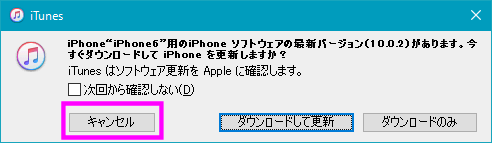 新しいiOSの更新を進めてきますが、せっかくダウングレードした意味がなくなるので、「キャンセル」をクリックします。