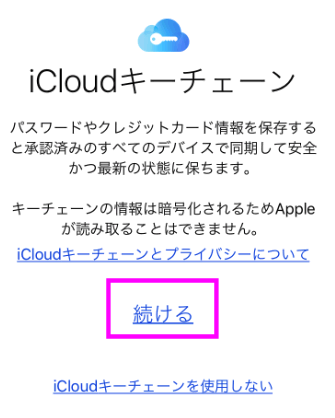 iCloudキーチェーンを使うか表示されるので「続ける」をタップします。
