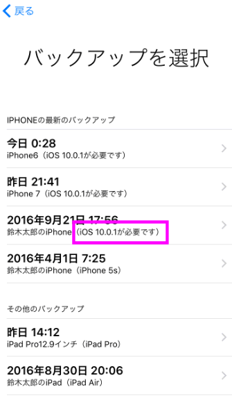 例えばiOS10からiOS9に戻す場合、iOS9時のバックアップがパソコンかiCloudに保存されていないと、復元できません。