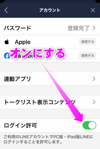あと、iPhoneのLINEの設定の「アカウント」の「ログイン許可」をオンにしていますか?