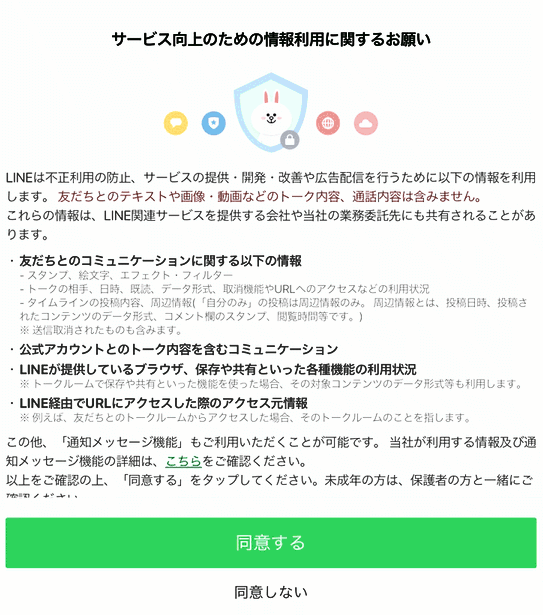 「サービス向上のための情報利用に関するお願い」が表示されます。目を通して「同意する」をタップします。