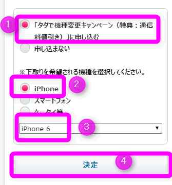 下取りに出す場合は、①「タダで機種変更キャンペーン」に申し込むにチェックを入れ、②どの端末を下取りに出すか、選択します。