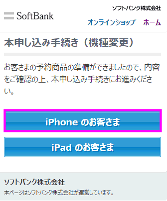 iPhoneをオンラインで購入する場合、「予約」をし、iPhoneの在庫が確認できたら「本申込」をします。なので、まずは予約。