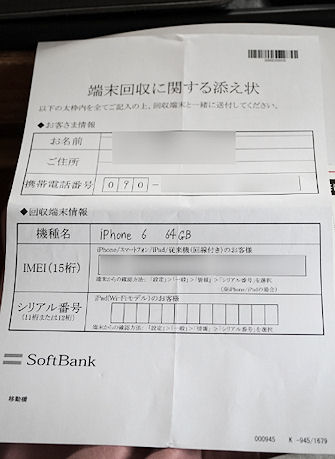 古いiPhoneと一緒に送る「端末回収に関する添え状」を記入します。