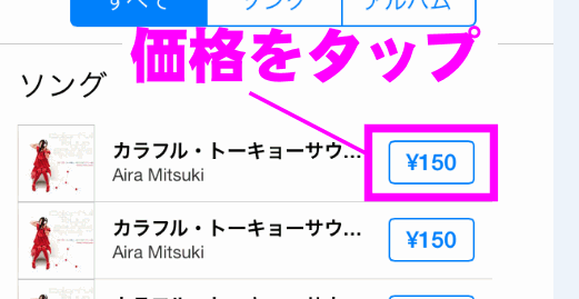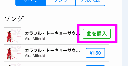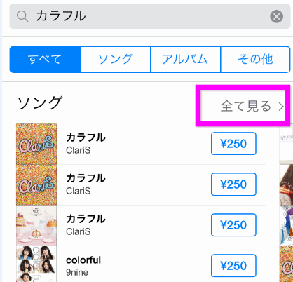 購入したい曲名の一部、もしくはアーチスト名の一部を入力(ここでは『カラフル』)し、検索をタップします。