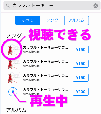 ジャケット部分をタップすると、45秒ほど曲を視聴する事ができます!