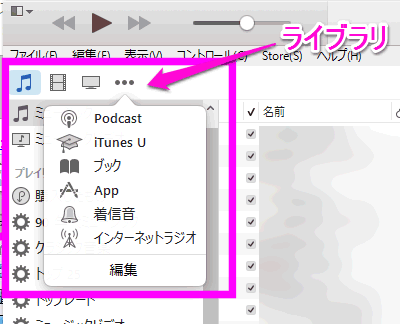 「・・・」の部分をクリックすると、ポッドキャストや着信音、電子ブックなどの項目もクリックできるようになります。