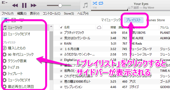 プレイリストや購入した曲などを表示させるには、iTunesの真ん中上辺りにある「プレイリスト」をクリックすると、左側に表示されます。