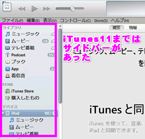 iTunes 11までは、左側にサイドバーが表示され、ここにライブラリ、プレイリストやデバイスのiPhoneなどが表示されていました。