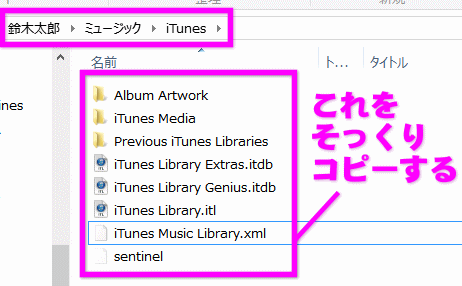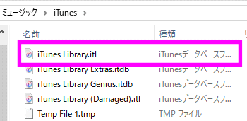 ここにある「iTunes Library.itl」というファイルがライブラリのファイルです。