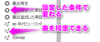 この違いなのですが、ダイアルのほうは「最近再生」とか「最近追加した項目」といった、条件によって登録された曲が変更するプレイリストです。