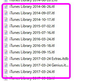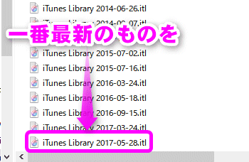 中身を確認してみると「iTunes Library 20XX-XX-XX.itl」のようにファイル名に日付が付加されてたくさん詰まっていました。