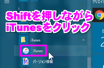 まず、iTunesを起動するときにキーボードの「Shiftキー」を押しながらiTunesのアイコンをクリックして起動してください。
