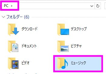 エクスプローラーを立ち上げ、「PC」内にある「ミュージック」を開きます。