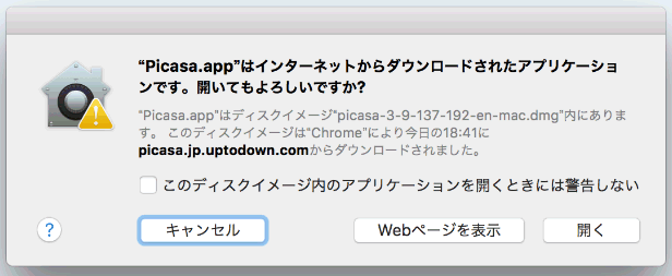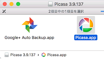 この「Picasa.app」をダブルクリックすると、Picasaというアプリが起動するのですが、このままだと先程の警告が表示されてしまいます。