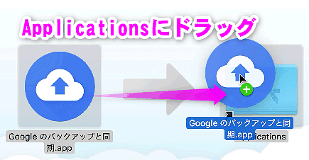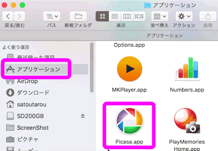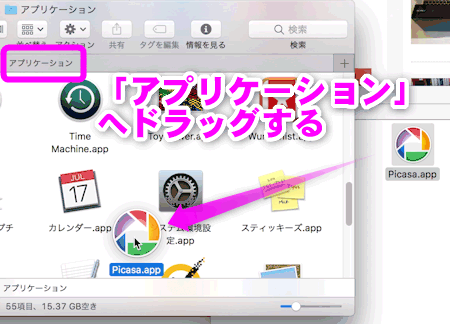 先ほど開いた「アプリケーション」のフォルダに「Picasa.app」をドラッグ&ドロップします。