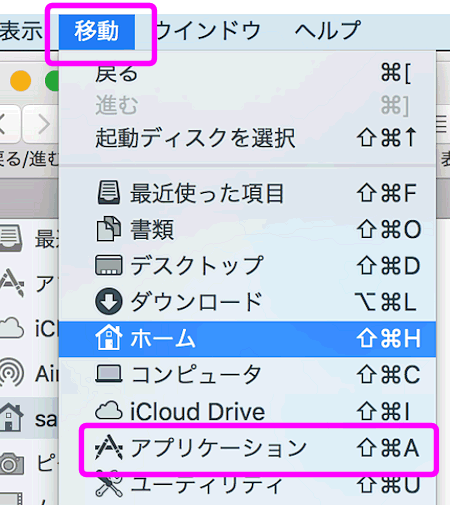 上のメニューに有る「移動」を開き、「アプリケーション」を選択します。