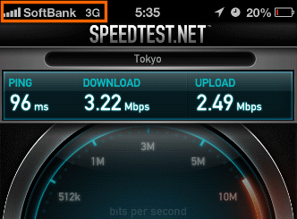 3Gで速度を測ってみると下り3.22Mbps。上りが意外とはやく2.49Mbps。