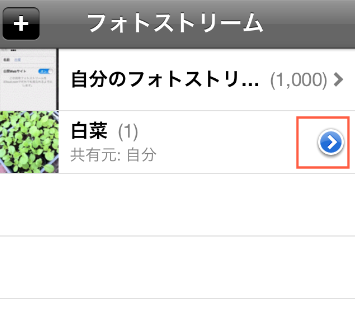 フォトストリームに収められている写真の1つをタップしてみると、左下に矢印のボタンが。