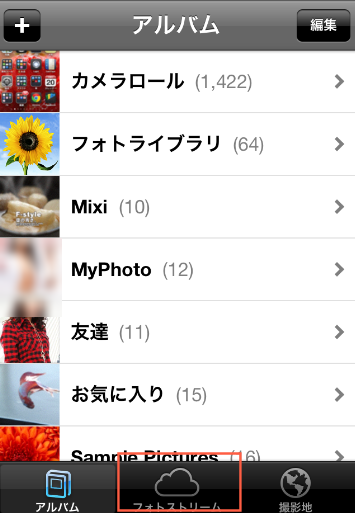 よく見ると画面下に「フォトストリーム」というタブが増えました。