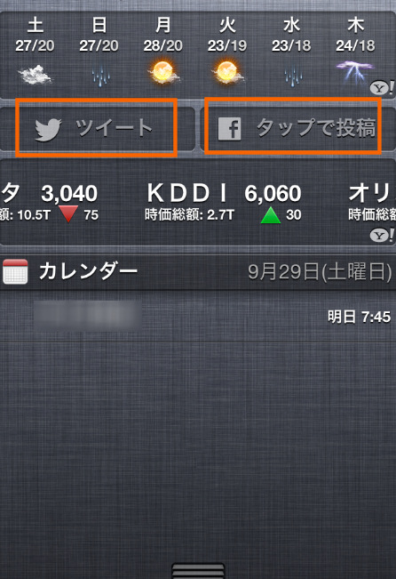通知センター(画面上から指でスライドさせると降りてくる)にツイッターとFacebookのつぶやきを入力できるフォームへのボタンが追加されました。