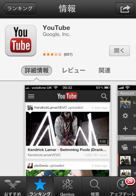 レビュータブをタップすると、評価が表示されます。