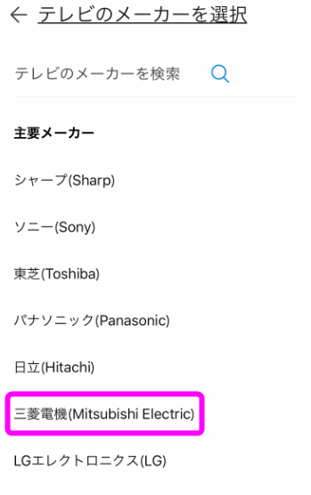 私の部屋のテレビは「三菱製」なので「三菱電機」をタップしました。
