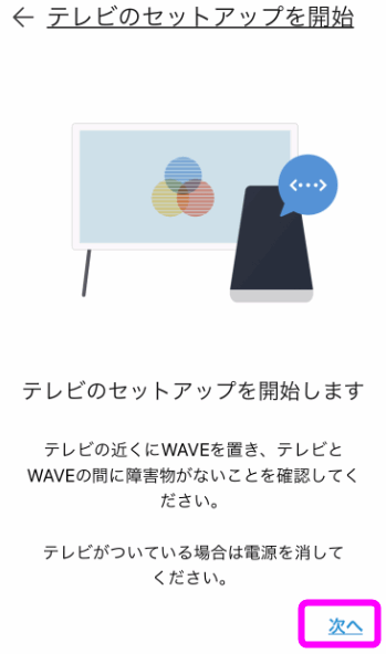 セットアップを開始します。と表示されるので、右下の「次へ」をタップします。