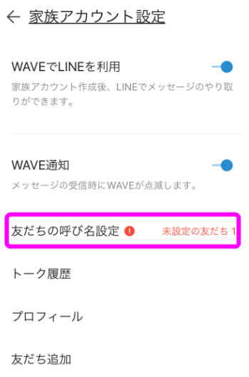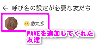 招待を送った友だちがWAVE専用のアカウントを友達登録してくれると、「友だちの呼び名設定」の横に赤い丸でビックリマークが表示されます。