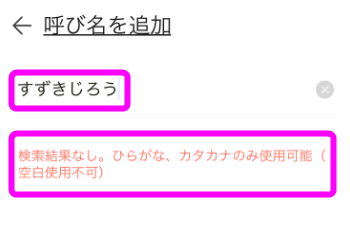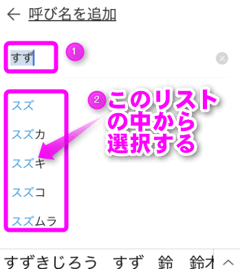 例えば「スズキ」という名前にする場合は、「すず」と入力すると候補が表示されるので、「スズキ」をタップして選択します。
