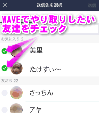 WAVE経由でメッセージを送りたい友だちにチェックを入れます。