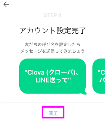 LINE Clovaアプリの画面が「アカウント設定完了」になっているので、「完了」をタップしてください。