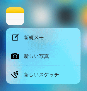 例えばメモ帳のアイコンを強く押すと、このように「新規メモ」「新しい写真」「新しいスケッチ」の3つのメニューが表示されます。