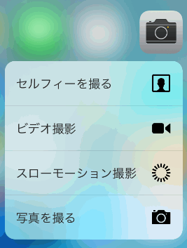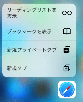 クィックアクションとは、アイコンを強く押す(PEEK)によって、表示されるメニューのショートカットです。