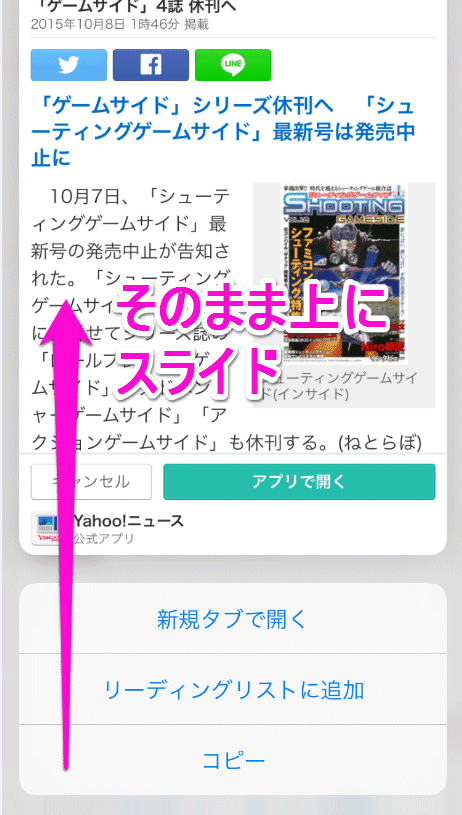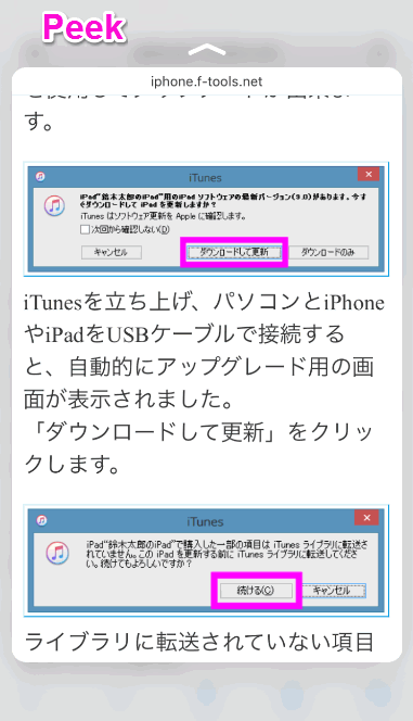 PEEKでは、リンク先を8割の大きさで開き、指を離すと元のページヘ戻ることが出来ます。